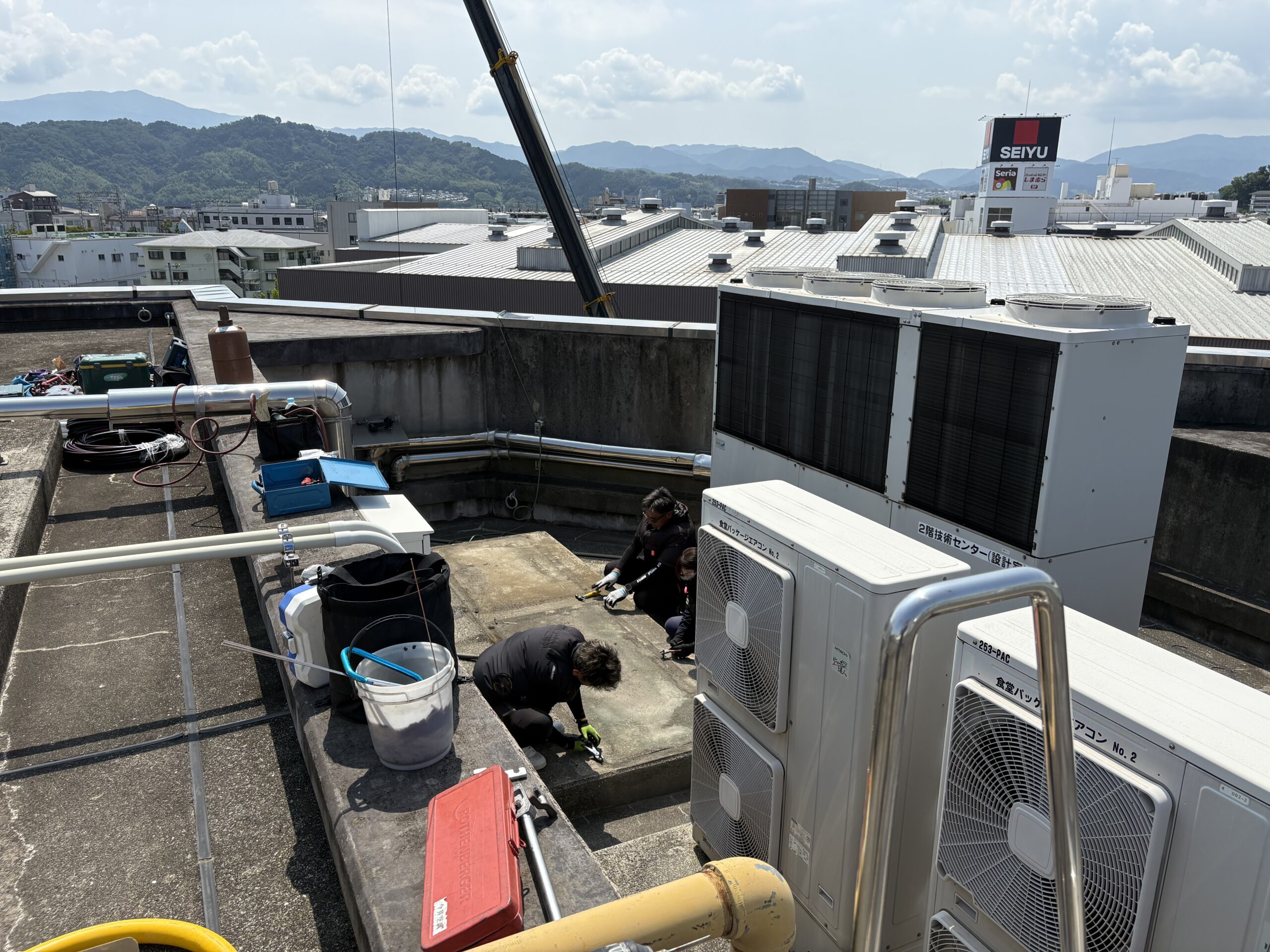 屋上設置機器の更新に伴い、レッカー作業を含む安全対策を徹底。